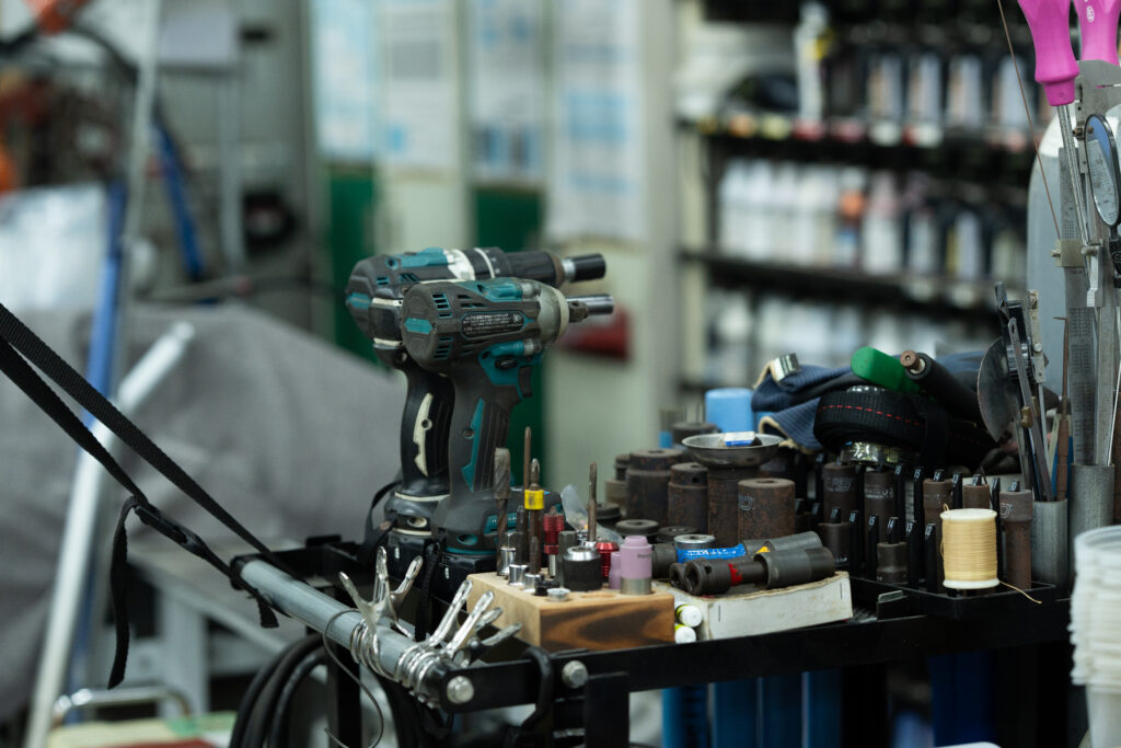 長年、自動車板金塗装の現場で培ってきた経験から、「いかに効率よく、美しく作業するか」を追求してきた代表の蓬野。彼の作業場は、同業者が見学に来るほどに整理整頓が行き届いています。使いやすい道具や部品の収納具を自作する中で、サンドペーパーの整理に課題を感じていました。既存のディスペンサーは、複数のサンドペーパーが同じ一本の筒に連なっており、ひとつの種類がなくなると全て取り外して交換する必要がありました。また、ダンボール製が多いため、湿度が高い宮崎では湿気で形が崩れてしまうこともありました。